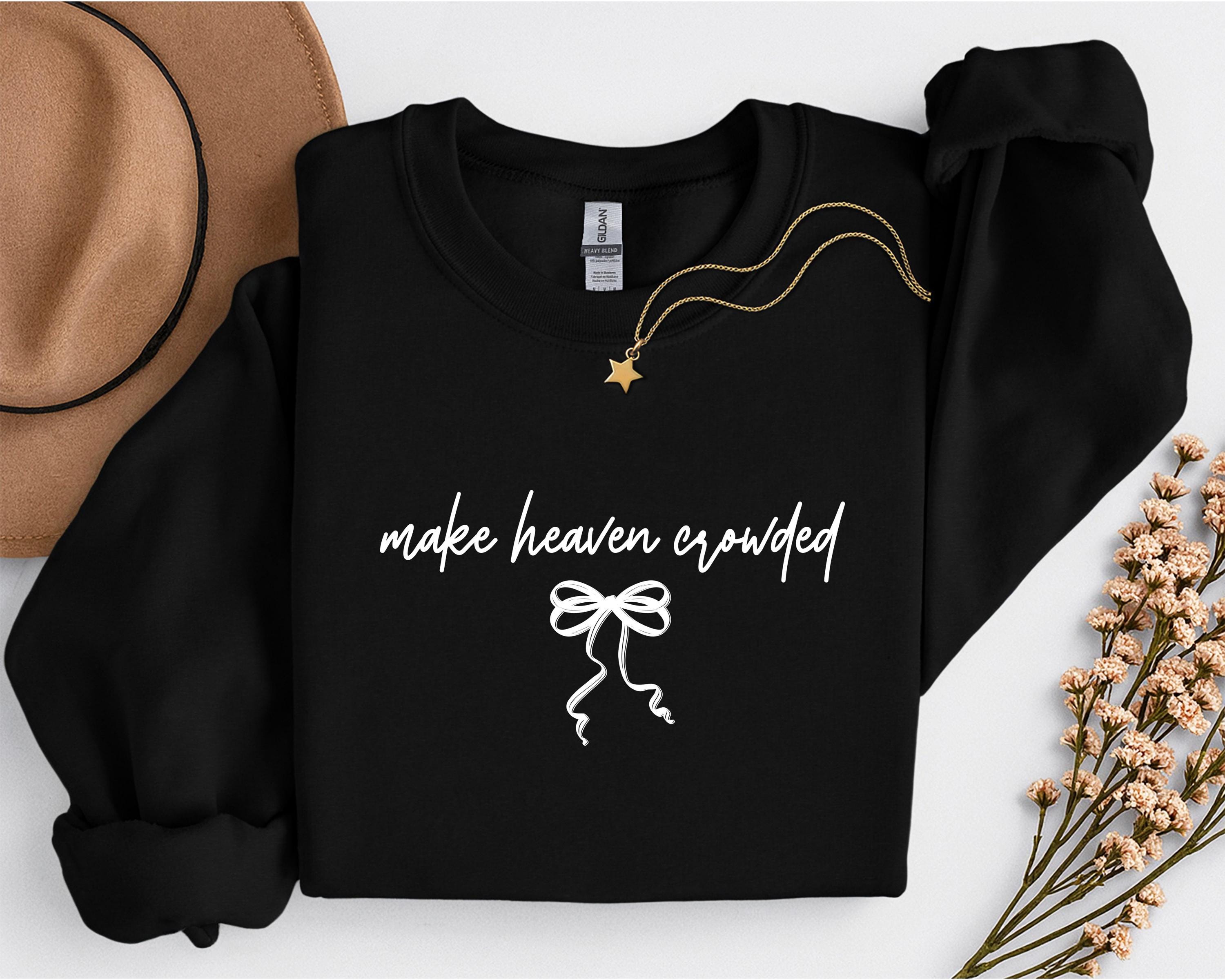 A lightweight, soft cotton crewneck with a quiet, heartfelt message. The front features delicate script reading "make heaven crowded" above a simple ribbon illustration — a gentle reminder of remembrance and faith that's subtle and wearable. The relaxed fit and light fabric make it easy to layer over a tee or wear on its own during church gatherings, memorial visits, or slow Sundays at home. Clean lines and minimal design keep the focus on the sentiment, letting it pair naturally with jeans, leggings, or a cozy scarf. It feels like a warm, thoughtful embrace you can slip into when you want comfort and calm.